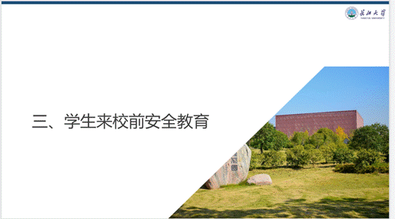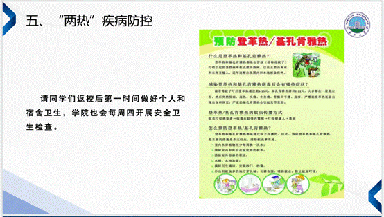 安全教育作为核心主题,谭辰阳从多维度展开:包括外出交通与安全、信息与网络安全、宿舍与消防安全以及饮食与运动安全四大方面。其中,重点强调了“两热”疾病防控、预防诈骗及心理健康教育三项内容,全面提升新生的风险防范意识和应急处置能力。