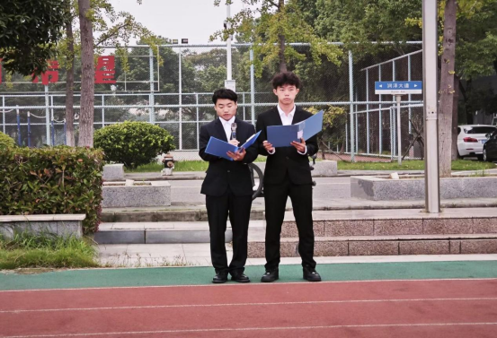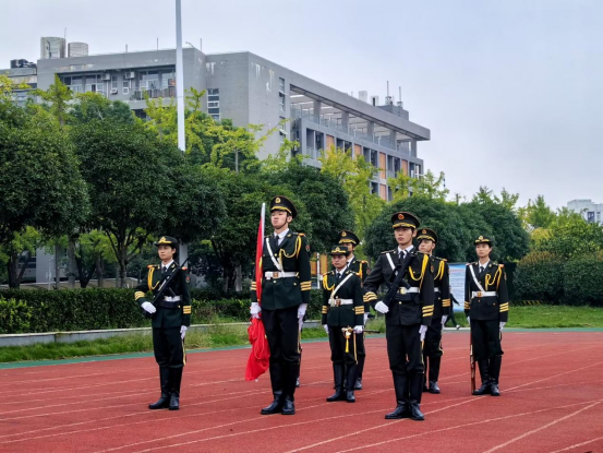 晨光熹微,国旗护卫队队员精神饱满、步伐铿锵,护送五星红旗走向升旗台。伴随着雄壮的《义勇军进行曲》,全场师生肃立注目,齐声高唱国歌,鲜艳的五星红旗在晨风中冉冉升起,飘扬于校园上空。
