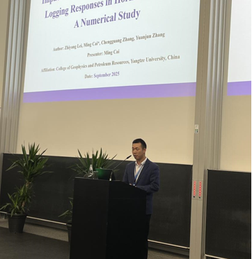 蔡明作了题为“Impact of Formation Interface on Acoustic Logging Responses in Horizontal Wells: A Numerical Study”的报告,介绍了团队在水平井旁层界面对井孔模式波的影响机理和规律的研究;张远君作了题为“A First-Arrival Compensation Method for Acoustic Logging Velocity Anomalies Induced by Tool Eccentricity”的报告,提出基于声波测井物理模拟实验结果仪器偏心声速的校正方法;张丽作了题为“A Study on Sand Yield Calculation Methods for Vertical Gas Wells Using Sand Detection Instruments”的报告,提出了基于井下出砂撞击国外新型出砂检测仪SDT的声学数据处理方法,讨论了声学在测井上的应用。三个报告均得到与会专家关注,相关专家与我校师生进行了深入交流。