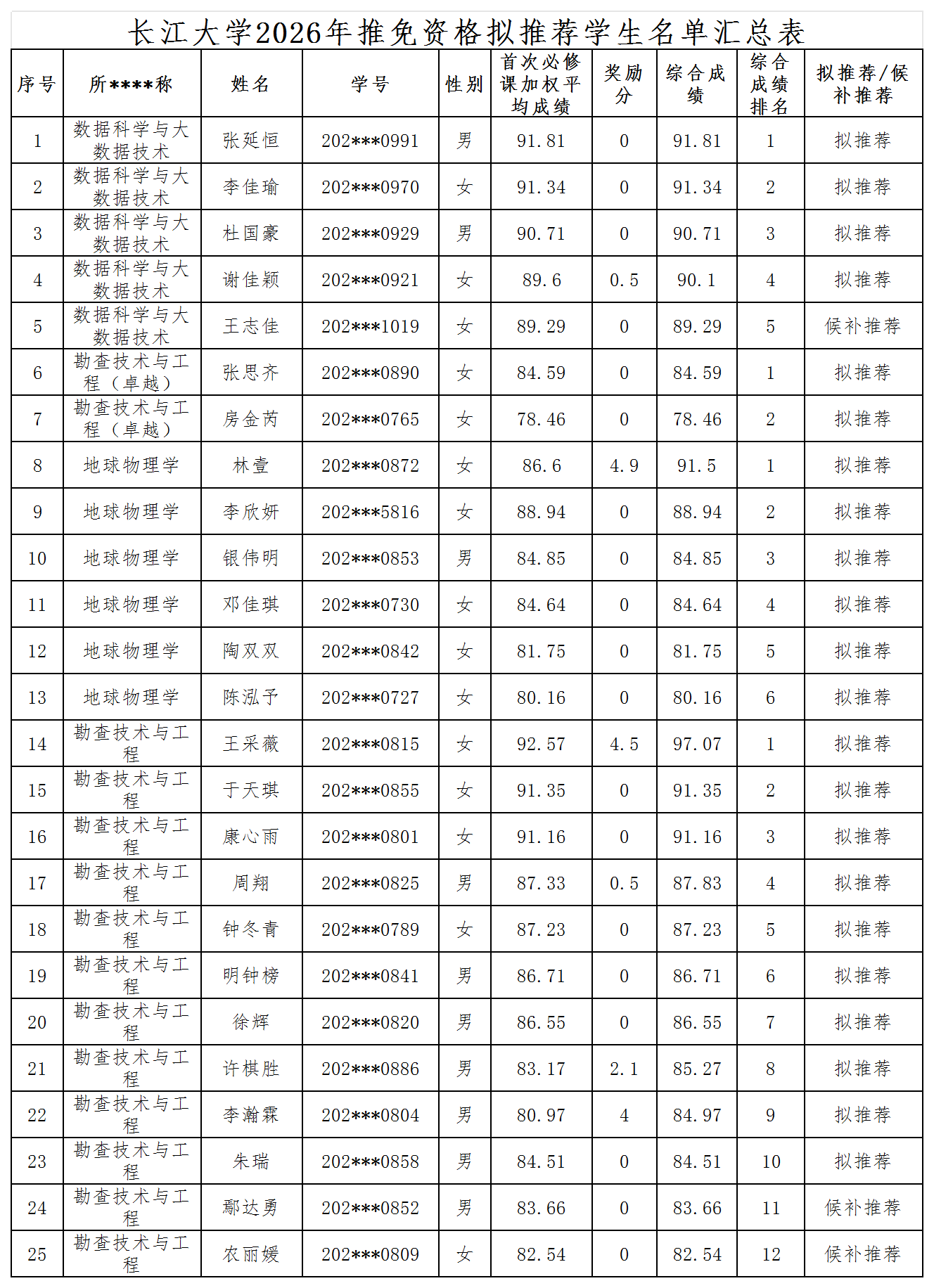 根据《ok138太阳集团中国官方网站推荐优秀应届本科毕业生免试攻读硕士学位研究生管理办法》(长大校发〔2025〕9号)、《关于做好推荐2026届优秀本科毕业生免试攻读硕士学位研究生工作的通知》、《关于推荐2026届优秀本科毕业生免试攻读硕士学位研究生名额分配的通知》和《地球物理与石油资源学院推荐2026届优秀本科毕业生免试攻读硕士学位研究生推免名额分配方案》要求,结合学院实际,经学生本人申请,学校相关部门和学院审核,学院推免生遴选工作小组审议通过,现将ok138太阳集团中国官方网站拟推荐2026届优秀本科毕业生免试攻读硕士学位研究生分专业按推免生名额的120%(其中20%为候补人员)进行公示。在公示期间,若拟推荐学生不符合条件或放弃推免资格,则依据候补人选的排名由候补人选依次递补,如没有递补学生的专业有学生不符合条件或放弃推免资格,则按候补学生的综合排名来依次递补。公示时间:2025年9月12日至2025年9月14日。